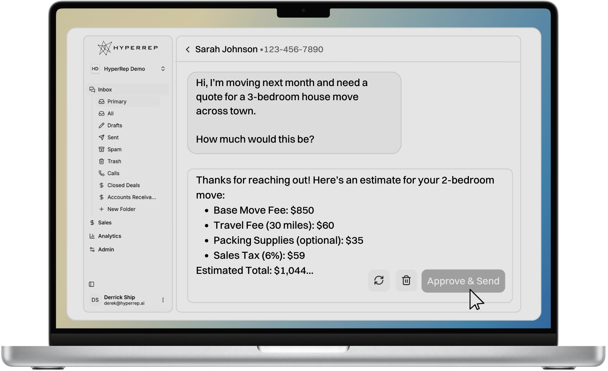 Nothing is sent without your review. Review the generated response and quote, make any necessary edits, and approve with a single click. The message is sent over email, text, or livechat, and HyperRep will learn and improve on edits you make.